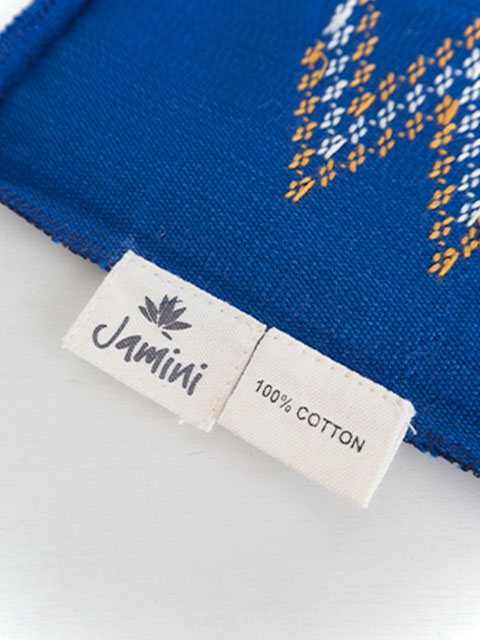 Jamini ジャミニのほとんどの製品は、インドで製作されています。インドの伝統的技法である、ブロックプリントを使用している製品は、プリントの擦れ、にじみ、色ムラ、絵柄が少しずれている部分などがございます。また、日本の縫製に比べ、ミシンの縫い目が少し曲がっていたり、角が直角に縫製されていなかったりと、縫製がやや粗い部分がございます。これらはJamini ジャミニ製品によく見られる製品の特性となりますので、ご注文いただく際は予めご了承下さいますよう宜しくお願いいたします。製品へのご質問、ご不明な点などございましたら、ご注文前にお気軽にお問い合わせ下さいませ。