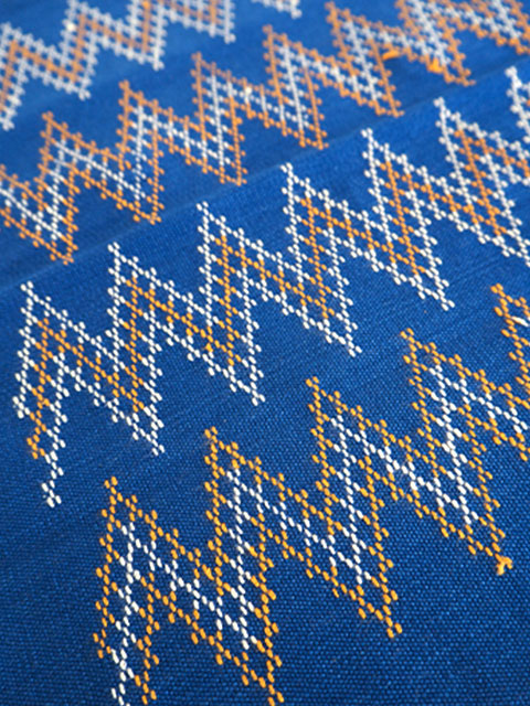 表面の程よい厚みの良質な手織り生地は、インドの北東部、ミゾラム地方に古くから伝わる技術で、ミゾ族の伝統的技術として世代を超えて受け継がれています。織り込まれた絵柄は、伝統的な織物のモチーフからインスピレーションを得て、伝統と現代性を絶妙のバランスで表現しています。発色の良い綺麗なブルーにイエローとホワイトのクロスステッチのような可愛い模様がよく映えます。