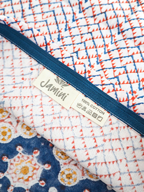 Jamini ジャミニのほとんどの製品は、インドで製作されています。インドの伝統的技法である、ブロックプリントを使用している製品は、プリントの擦れ、にじみ、色ムラ、絵柄が少しずれている部分などがございます。また、日本の縫製に比べ、ミシンの縫い目が少し曲がっていたり、角が直角に縫製されていなかったりと、縫製がやや粗い部分がございます。これらはJamini ジャミニ製品によく見られる製品の特性となりますので、ご注文いただく際は予めご了承下さいますよう宜しくお願いいたします。製品へのご質問、ご不明な点などございましたら、ご注文前にお気軽にお問い合わせ下さいませ。