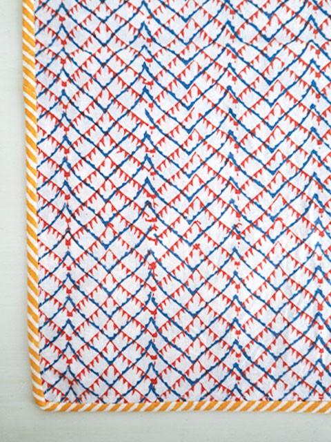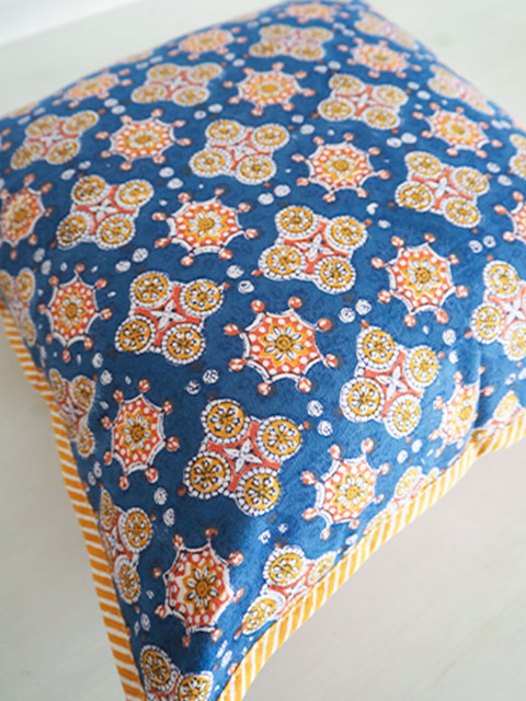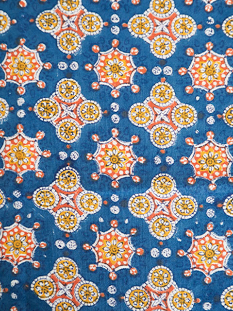 表面の程よい厚みの良質なコットン生地の上には、あじわいのある綺麗なブルーをベースに、オレンジやイエローのエスニック調の可愛い幾何学模様が「ブロックプリント」の技法を用いてプリントされています。小さい花火のような絵柄と、カラフルな色使いがとても素敵です。