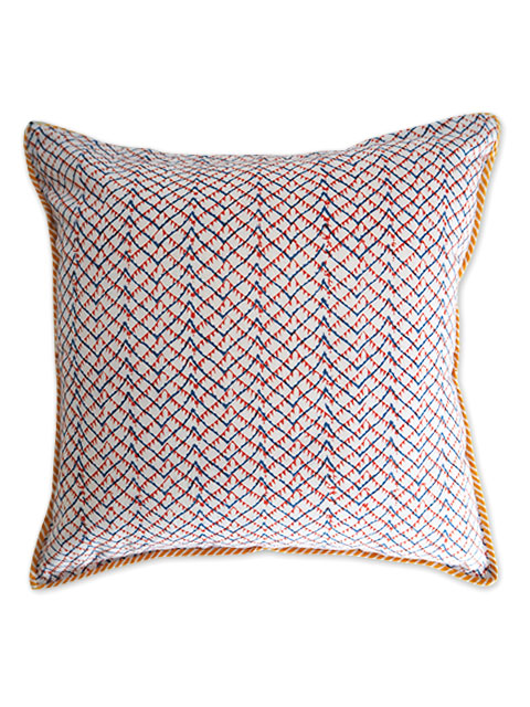 こちらは、ANTARAシリーズ、ブルー色のクッションカバーです。表面の程よい厚みの良質なコットン生地の上には、あじわいのある綺麗なブルーをベースに、オレンジやイエローのエスニック調の可愛い幾何学模様が「ブロックプリント」の技法を用いてプリントされています。小さい花火のような絵柄と、カラフルな色使いがとても素敵です。裏面は、オフホワイト色をベースに、少しニュアンスのあるレッドとブルーで、線と線が重なったような幾何学模様が、手描きタッチで可愛く描かれています。インテリアに合わせて2通りのデザインをお楽しみいただけます。インドの伝統的技法であるブロックプリントは、彫刻された木のブロックを使い、熟練された職人さんによって丁寧に手刷りされています。ブロックプリントならではの独特の美しさ、あじわいが感じられます。しっかりとしたコットン生地、フチは可愛くパイピングされ、年間ご使用いただける、とても素敵なクッションカバーに仕上がっています。海外のインテリアのように、色々なテイストのクッションとミックスしてベットやソファに並べたり、ラグの上に無造作に置いてもとても可愛いですよ。素敵なインテリアのアクセントアイテム、お気に入りのお部屋のリラックススペースにぜひ。