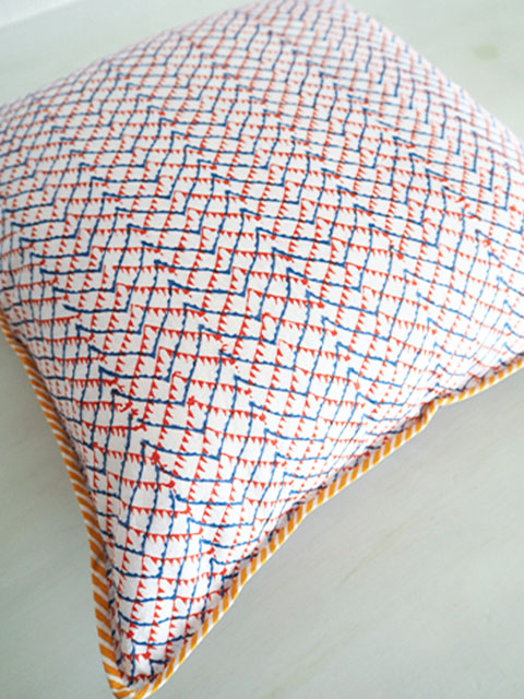 ↑↓クッションをぐるりと囲む四隅の端は、可愛い生地でパイピングされています。こちらのパイピングが全体のアクセントになっています。