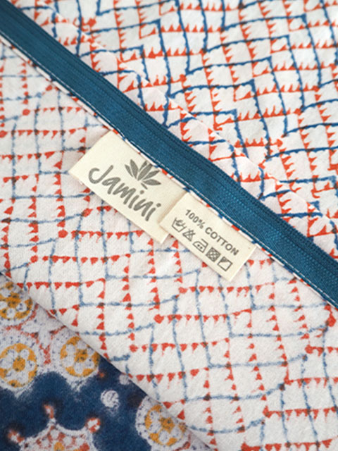 Jamini ジャミニのほとんどの製品は、インドで製作されています。インドの伝統的技法である、ブロックプリントを使用している製品は、プリントの擦れ、にじみ、色ムラ、絵柄が少しずれている部分などがございます。また、日本の縫製に比べ、ミシンの縫い目が少し曲がっていたり、角が直角に縫製されていなかったりと、縫製がやや粗い部分がございます。これらはJamini ジャミニ製品によく見られる製品の特性となりますので、ご注文いただく際は予めご了承下さいますよう宜しくお願いいたします。製品へのご質問、ご不明な点などございましたら、ご注文前にお気軽にお問い合わせ下さいませ。