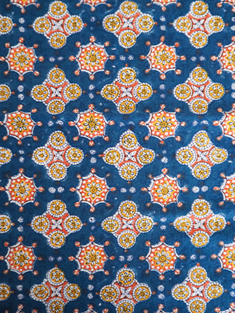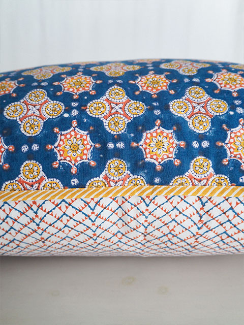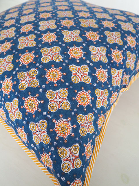 表面の程よい厚みの良質なコットン生地の上には、あじわいのある綺麗なブルーをベースに、オレンジやイエローのエスニック調の可愛い幾何学模様が「ブロックプリント」の技法を用いてプリントされています。小さい花火のような絵柄と、カラフルな色使いがとても素敵です。