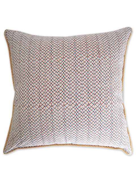 こちらは、ANTARAシリーズ、ブルー色のクッションカバーです。表面の程よい厚みの良質なコットン生地の上には、あじわいのある綺麗なブルーをベースに、オレンジやイエローのエスニック調の可愛い幾何学模様が「ブロックプリント」の技法を用いてプリントされています。小さい花火のような絵柄と、カラフルな色使いがとても素敵です。裏面は、オフホワイト色をベースに、少しニュアンスのあるレッドとブルーで、線と線が重なったような幾何学模様が、手描きタッチで可愛く描かれています。インテリアに合わせて2通りのデザインをお楽しみいただけます。インドの伝統的技法であるブロックプリントは、彫刻された木のブロックを使い、熟練された職人さんによって丁寧に手刷りされています。ブロックプリントならではの独特の美しさ、あじわいが感じられます。しっかりとしたコットン生地、フチは可愛くパイピングされ、年間ご使用いただける、とても素敵なクッションカバーに仕上がっています。海外のインテリアのように、色々なテイストのクッションとミックスしてベットやソファに並べたり、ラグの上に無造作に置いてもとても可愛いですよ。素敵なインテリアのアクセントアイテム、お気に入りのお部屋のリラックススペースにぜひ。
