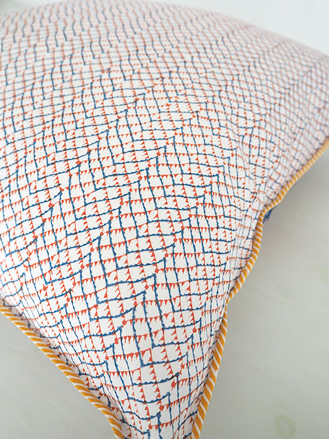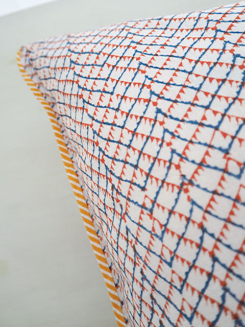 ↑↓クッションをぐるりと囲む四隅の端は、可愛い生地でパイピングされています。こちらのパイピングが全体のアクセントになっています。
