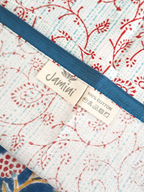 Jamini ジャミニのほとんどの製品は、インドで製作されています。インドの伝統的技法である、ブロックプリントを使用している製品は、プリントの擦れ、にじみ、色ムラ、絵柄が少しずれている部分などがございます。また、日本の縫製に比べ、ミシンの縫い目が少し曲がっていたり、角が直角に縫製されていなかったりと、縫製がやや粗い部分がございます。これらはJamini ジャミニ製品によく見られる製品の特性となりますので、ご注文いただく際は予めご了承下さいますよう宜しくお願いいたします。製品へのご質問、ご不明な点などございましたら、ご注文前にお気軽にお問い合わせ下さいませ。