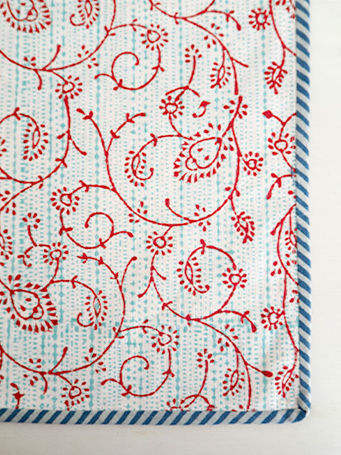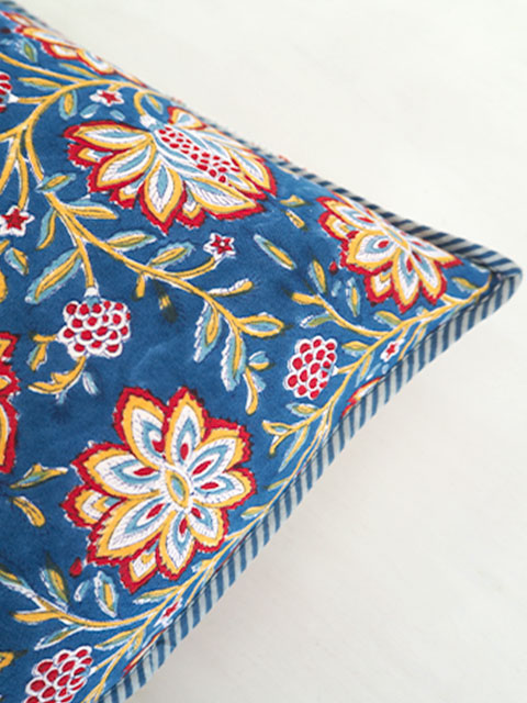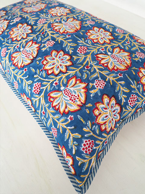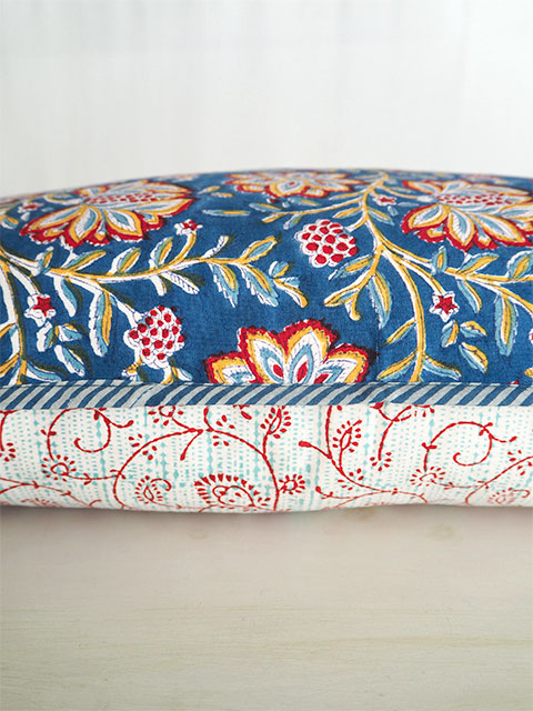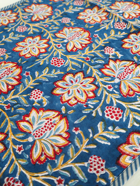 表面の程よい厚みの良質なコットン生地の上には、少しくすんだ深みのあるブルーをベースに、赤や黄色のインドらしいお花や植物が「ブロックプリント」の技法を用いてプリントされています。どこか高級感のある、クラシックな雰囲気の色柄がとても素敵ですよ~。