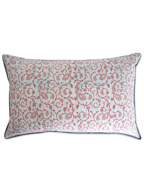 こちらは、LOUISEシリーズ、ブルー色のクッションカバーです。表面の程よい厚みの良質なコットン生地の上には、少しくすんだ深みのあるブルーをベースに、赤や黄色のインドらしいお花や植物が「ブロックプリント」の技法を用いてプリントされています。どこか高級感のある、クラシックな雰囲気の色柄がとても素敵ですよ~。裏面は、オフホワイト色をベースに、水色の点状のストライプ柄と、線画タッチで描かれた赤のエスニック柄が可愛く描かれています。インテリアに合わせて2通りのデザインをお楽しみいただけます。インドの伝統的技法であるブロックプリントは、彫刻された木のブロックを使い、熟練された職人さんによって丁寧に手刷りされています。ブロックプリントならではの独特の美しさ、あじわいが感じられます。しっかりとしたコットン生地、フチは可愛くパイピングされ、年間ご使用いただける、とても素敵なクッションカバーに仕上がっています。海外のインテリアのように、色々なテイストのクッションとミックスしてベットやソファに並べたり、ラグの上に無造作に置いてもとても可愛いですよ。素敵なインテリアのアクセントアイテム、お気に入りのお部屋のリラックススペースにぜひ。