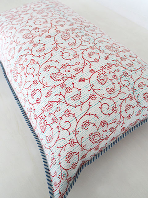↑↓クッションをぐるりと囲む四隅の端は、可愛い生地でパイピングされています。こちらのパイピングが全体のアクセントになっています。