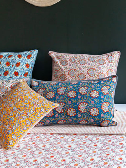 ↑↓華やかさの中にある、あじわいある素朴な雰囲気は、手刷りのブロックプリントならでは。インド x フランスの文化の融合、2国のミックス感が『Jamini・ジャミニ』製品の魅力です。