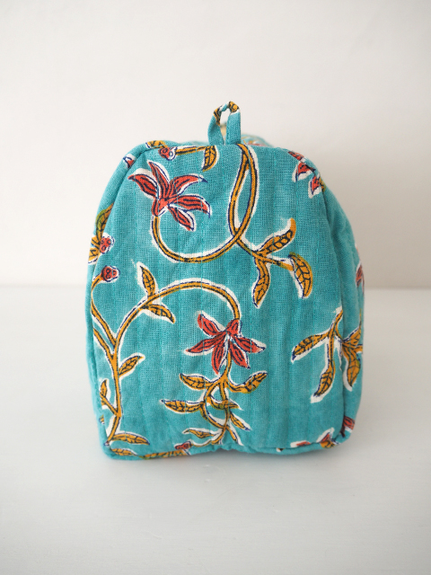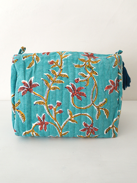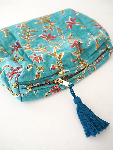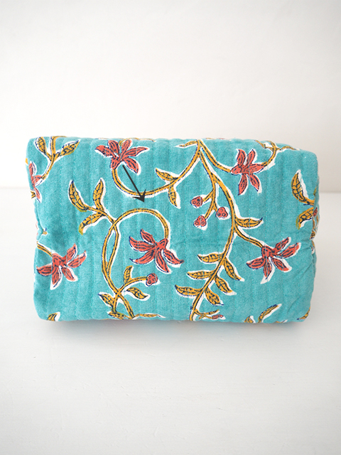 こちらは、ANAMIKAシリーズ、ターコイズブルー色のミディアムポーチです。ビッグポーチよりひと回り小さい、程よいサイズ感、マチがありますので、小物がたくさん入ります。化粧ポーチの他にも、サニタリーグッズ、モバイル用の充電器やイヤホンなど、小物の収納ポーチにオススメです。表面は、爽やかなターコイズブルー色をベースに、少しくすんだ赤と黄色の可愛いお花や植物がデザインされたブロックプリント生地が使用されています。インドの伝統的技法であるブロックプリントは、彫刻された木のブロックを使い、熟練された職人さんによって丁寧に手刷りされています。ブロックプリントならではの独特の美しさ、あじわいが感じられる、とても素敵なポーチに仕上がっています。内側は、素朴なナチュラルコットン生地が使用され、ポケットも付いていますので機能的です。お気に入りの小物の収納袋、お気に入りのバッグのお供にぜひ!