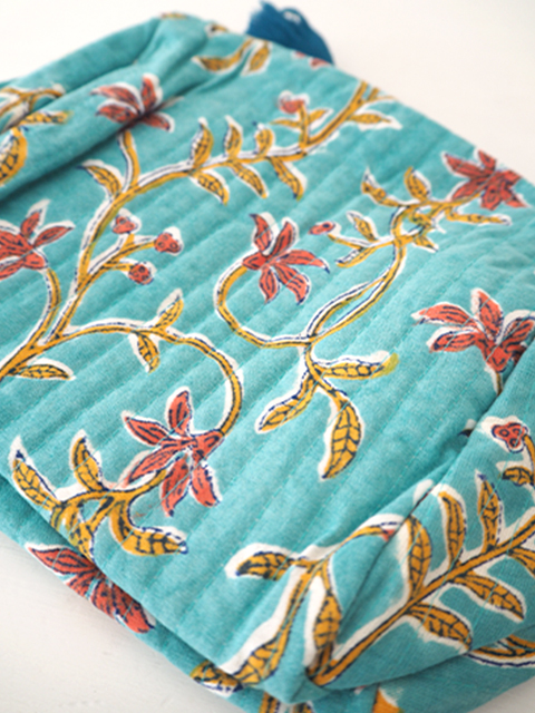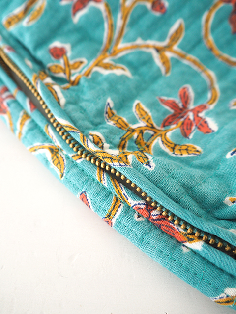 (*ANAMIKA Turquoiseのポーチの表面に使用されているブロックプリント生地は、爽やかなターコイズブルーをベースに、シンプルで素朴な雰囲気のお花や植物がデザインされています。ターコイズブルーに赤と黄色のお花が映えて、とっても可愛いです。)