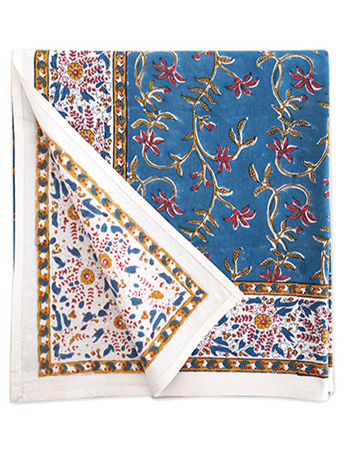 インドの伝統的技法であるブロックプリントは、彫刻された木のブロックを使い、熟練された職人さんによって丁寧に手刷りされています。ブロックプリントならではの独特の美しさ、あじわいが感じられる、とても素敵なテーブルクロスに仕上がっています。テーブルクロスとしてはもちろん、上端をカーテンクリップなどで挟んだ簡易カーテン、空間の間仕切り布など、マルチクロスとして色々な用途にご使用いただけます。素敵なテーブルコーディネート、インテリアのアクセントアイテムにぜひ。