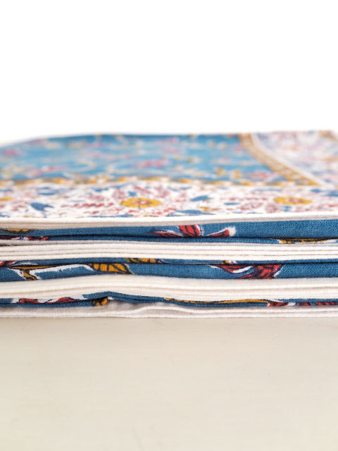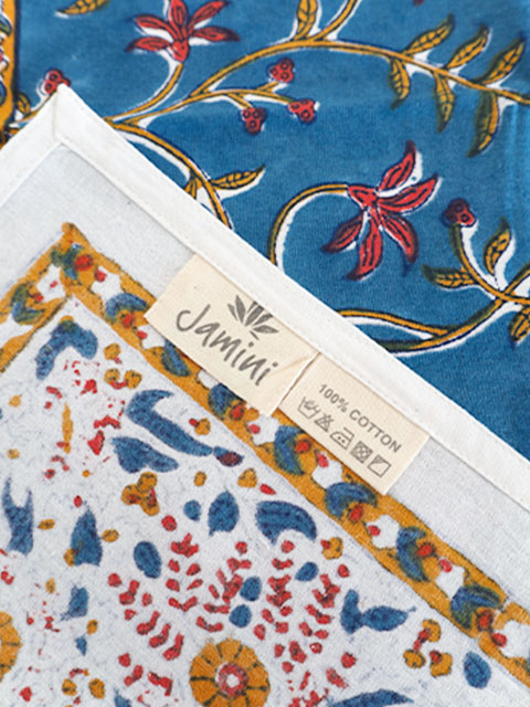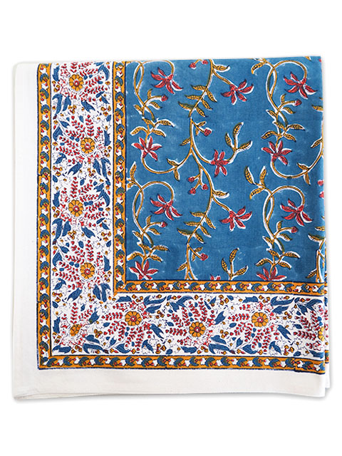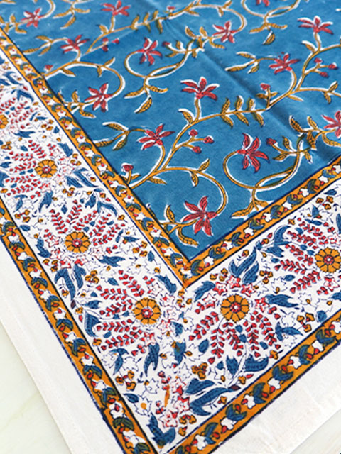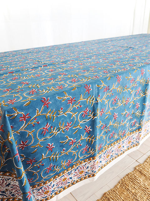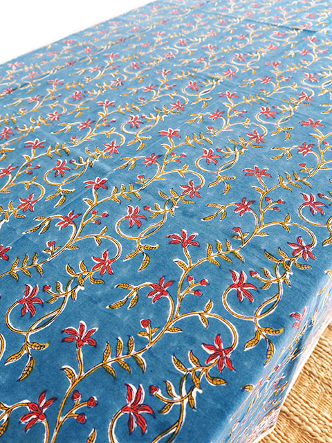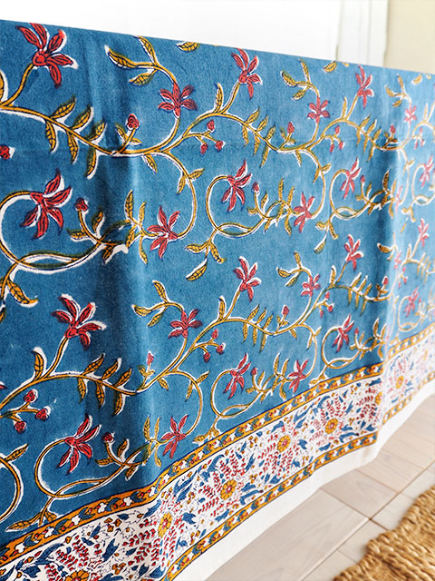 こちらは、ANAMIKAシリーズ、ジーンズブルー色のテーブルクロスです。程よい厚みの良質なコットン生地の上には、深みのあるブルージーンズ色をベースに、シンプルで素朴な雰囲気のお花や植物が「ブロックプリント」の技法を用いてプリントされています。あじわい深いブルーにニュアンスのあるくすんだ赤と黄色のお花が映えて、とっても可愛いです。