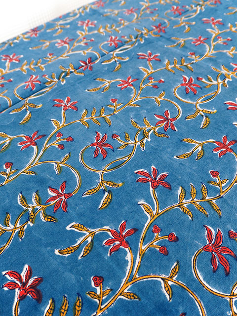 ↑↓程よい厚みの良質なコットン生地の上には、深みのあるブルージーンズ色をベースに、シンプルで素朴な雰囲気のお花や植物が「ブロックプリント」の技法を用いてプリントされています。あじわい深いブルーにニュアンスのあるくすんだ赤と黄色のお花が映えて、とっても可愛いです。