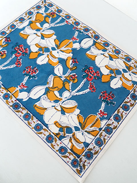 こちらは、IRISシリーズ、ジーンズブルー色のテーブルマット(ランチョンマット)です。程よい厚みの良質なコットン生地の上には、少しくすんだニュアンスのあるジーンズブルー色をベースに、ホワイトと少しくすんだ黄色、あじわいのある赤色の可愛いIRISのお花が「ブロックプリント」の技法を用いてプリントされています。日本であまり見かけないIRIS= アヤメの花柄が斬新でとても素敵です。インドの伝統的技法であるブロックプリントは、彫刻された木のブロックを使い、熟練された職人さんによって丁寧に手刷りされています。ブロックプリントならではの独特の美しさ、あじわいが感じられる、とても素敵なテーブルマット(ランチョンマット)に仕上がっています。テーブルマット(ランチョンマット)としてはもちろん、電話の敷布、フラワーベース、雑貨などのディスプレイ敷布などにもオススメです。素敵なキッチン、インテリアのアクセントアイテムにぜひ。