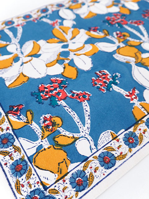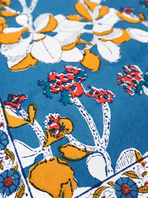 ↑↓程よい厚みの良質なコットン生地の上には、少しくすんだニュアンスのあるジーンズブルー色をベースに、ホワイトと少しくすんだ黄色、あじわいのある赤色の可愛いIRISのお花が「ブロックプリント」の技法を用いてプリントされています。日本であまり見かけないIRIS= アヤメの花柄が斬新でとても素敵です。