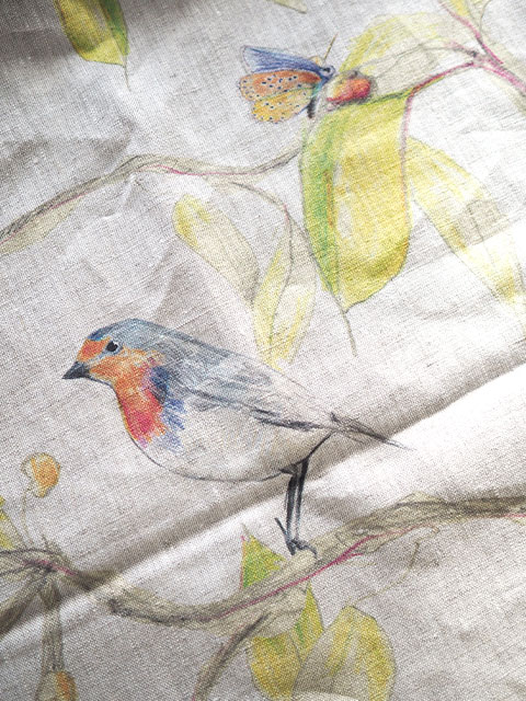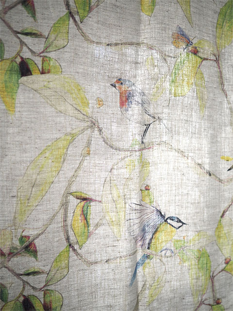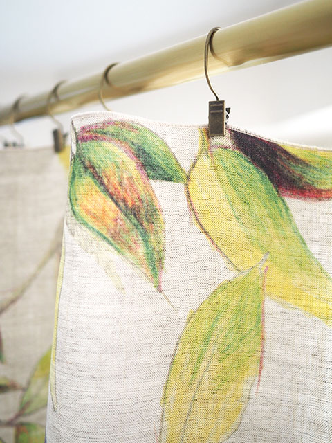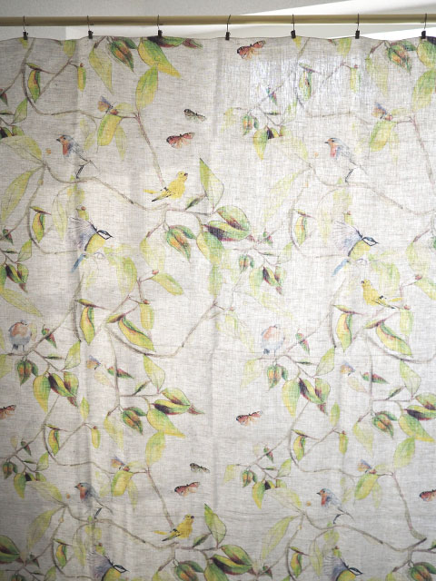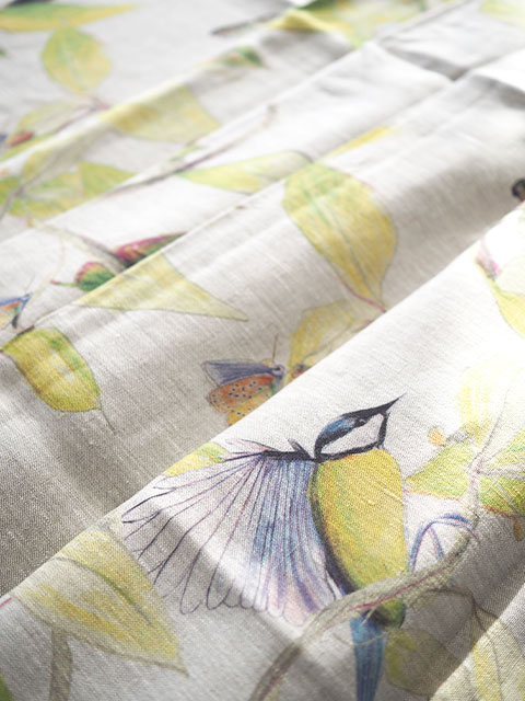 ↑↓こちらは、グラフィックデザイナー、イラストレーター、スタイリストとしても活躍するNina Bonomo(ニナ ボノモ)のデザインを、ナチュラルなリネン生地にプリントしたカーテンです。(*リネンプリント生地のフチをサテンステッチで仕上げた、カーテンクリップに挟んでご使用いただくタイプのカーテンです。フラットな1枚布ですので、マルチクロスとしてもご使用いただけます。)「CIME シーム」("CIME"は、フランス語で梢、木の幹や枝の先を意味します。)、赤い実のなった木、葉っぱ、枝にとまった可愛い小鳥や蝶をモチーフにしています。バックのナチュラルなリネンをベースに、黄緑、緑、オレンジ、ブルーなど、明るい色合いの色鉛筆のような線画で描かれています。ナチュラルでやさしく、あたたかく、どこか繊細な雰囲気でとても素敵です。