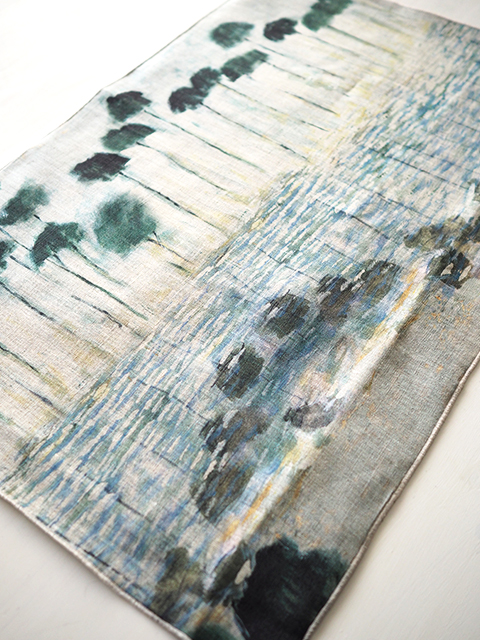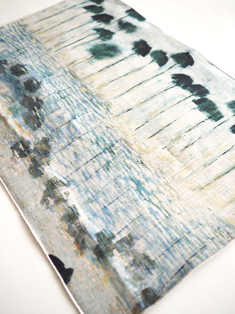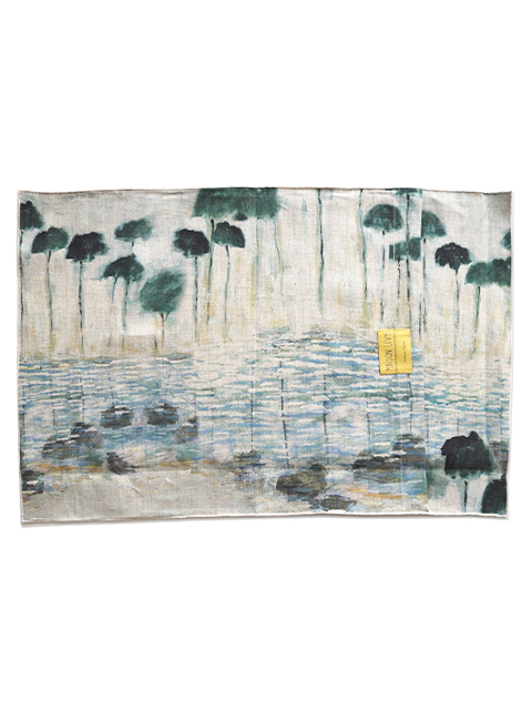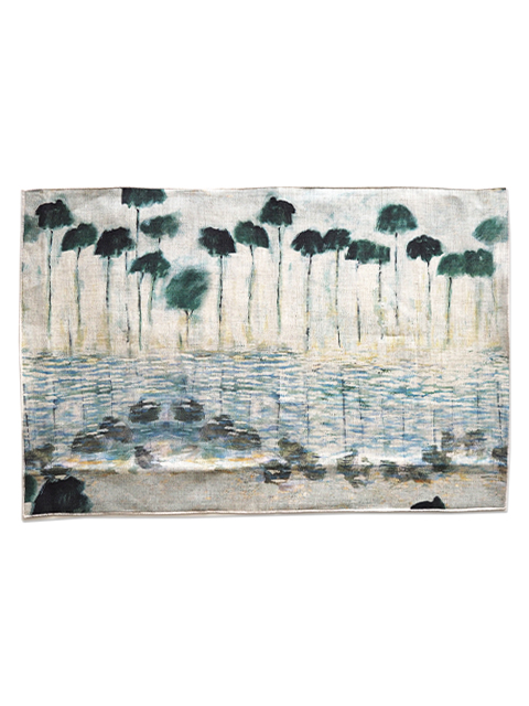 ↑↓こちらは、アルゼンチン、ブエノスアイレスの画家、Haby Bonomo(アヴィ ボノモ)の風景画を、ナチュラルなリネン生地にプリントしたクッションカバーです。「REFLEJOS」という、海辺の風景を描いた、シリーズの中の1つで、「 REFLEJOS AGUA」、ヤシの木と光が反射した水面をモチーフにしてます。ヤシの木、水面に映ったヤシの木、透明感のある水の質感やキラキラとした光が、ブラック寄りの深いダークグリーンと、淡いブルーのグラデーション、ベージュを基調に、繊細な色合いで表現されています。Habyにしか出せない、独特のあじわい深いタッチで描かれた風景画は、やさしく、どこか懐かしい雰囲気でとても素敵です。(*W60xH40cmのクッション中材は別売りです。)