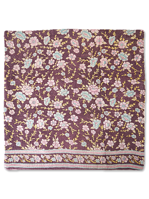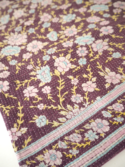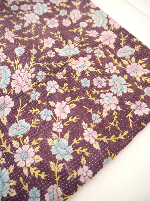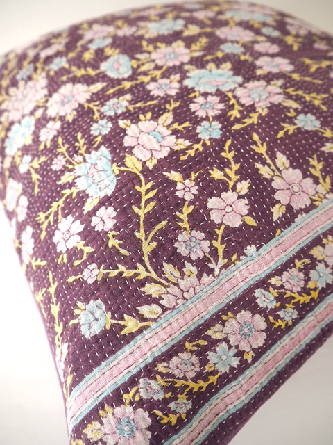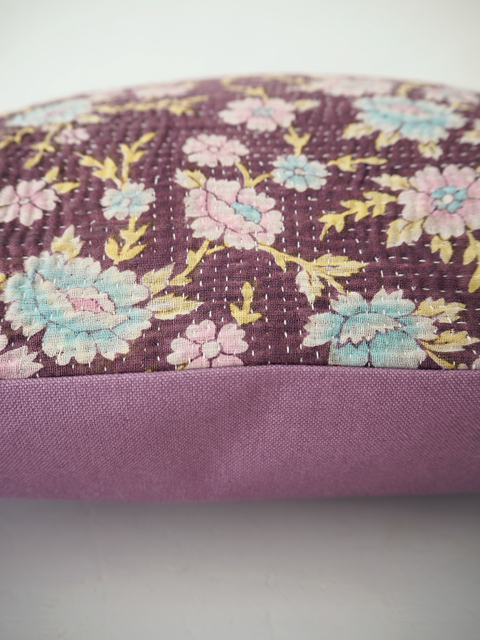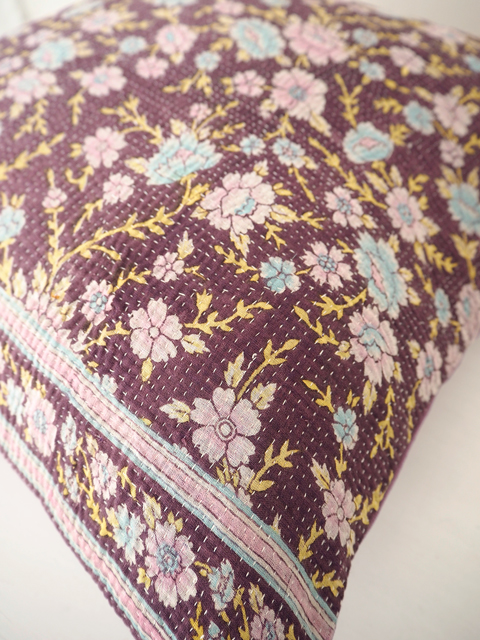 ↑↓くすんだバーガンディ色に、淡いピンクと水色のお花と黄色の葉っぱがよく映えます。こちらのクッションカバーに使用しているVintage Kantha/ヴィンテージカンタは、とても細やかなステッチが丁寧に施されいます。